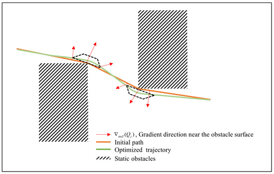 The convex quadrilateral produced by four knots on either side of the corner point is outside the obstruction, according to the inequality constraint, guaranteeing the safety of the associated stage. Figure 6 illustrates the steps taken to develop the initial trajectory into a feasible trajectory. The green line shows the optimum safety trajectory, while the red arrows indicate the gradient field formed by obstacles that push the orange initial trajectory outward.
