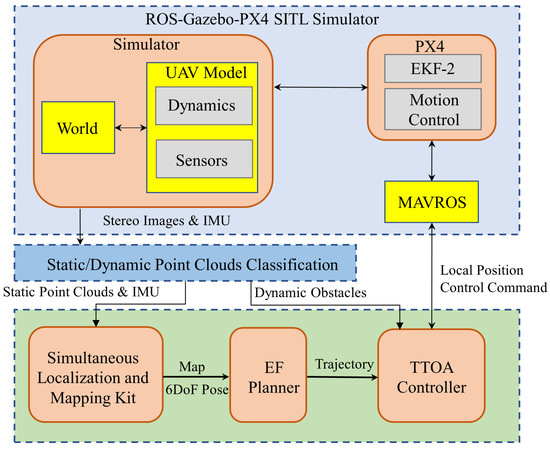 We simulated the EF planner and TTOA controller with static and mixed environments, respectively. The static environment was randomly generated by a point cloud map kit for random tests. The more general situation included dynamic and static obstacles, simulated in the ROS-Gazebo-PX4 SITL environment. Figure 9 shows the simulation framework in the general obstacle environment. All modules were simulated on an Intel Core i7-10700F CPU@2.9GHz with 16 G SSD.