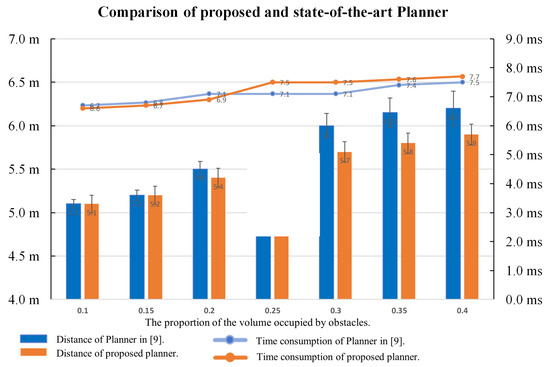 Comparison of the proposed and state-of-the-art planners in terms of time and distance, varying the obstacle density. The horizontal axis represents the proportion of the volume occupied by obstacles in the space.