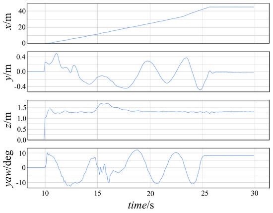 Figure 13 shows the comparison of the actual flight trajectory with [9,12]. The planned and real trajectory of the proposed work are red and blue, respectively. The planner proposed in [9] fails to deal with moving dynamic obstacles, while the planner proposed in [12] always flies with a longer trajectory. It can be seen that the UAV can not only fly smoothly in the static environment, but also fly safely in the environment with moving obstacles. Figure 14 shows the position and yaw of the UAV. The simulation shows that our approach is able to find the shortest and smoothest path compared with the existing planners. In addition, our method is more applicable because the dynamic obstacle avoidance problem is delegated to the obstacle avoidance controller with higher-frequency. Compared with existing methods, our method has the advantage of a stronger ability to deal with a dynamic environment. In the simulation, it was found that adding roll angle modulation can more easily realize the obstacle avoidance-based CBF.