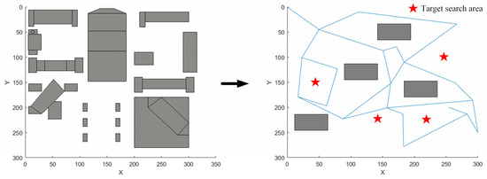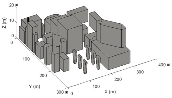 In a complex and dense urban environment, UAV patrols encounter a wide variety of obstacles, unevenly distributed and restricted by the complex constraints of the airspace environment. Three-dimensional environment modeling solves the prerequisite of UAV path planning. To improve the efficiency of UAV planning, create a simplified modeling diagram of the city’s three-dimensional space. Simplify various obstacles into rectangular bodies, and perform environmental modeling after simplifying all buildings, just like Figure 2. All buildings are avoidance areas for UAVs to fly, and the plane coordinates of the building are expressed as . The height is expressed as , and it is the number of plane coordinates of building coordinates. Where , is the number of buildings. Avoidance area constraints of ground UAVs are