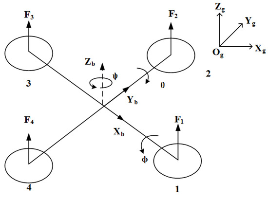 where, denotes the -dimensional unit matrix and denotes the -dimensional zero matrix. The quadrotor UAV system and coordinate system are shown in Figure 3.
