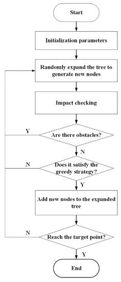 The RRT algorithm is currently considered the most advanced method for UAV path planning. It is particularly effective in navigating unexplored areas with ample space and few obstacles. However, due to its exhaustive search approach, it may not be suitable for directing UAVs to specific points. Therefore, to improve exploration efficiency and avoid blind search, we propose a greedy strategy that modifies the exploration path. This approach reduces exploration time, shortens the search path, and eliminates the search for unproductive blank areas.