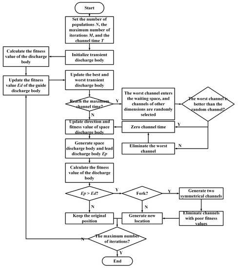 However, the new position does not guarantee channel formation unless is a better solution. If provides a better solution in the next step, then will be updated to , otherwise it will remain unchanged. If is better than the current iteration, then the spatial discharger becomes guide discharger.