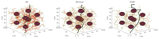 Where the black lines are the paths finally found by the three algorithms, the red lines are the branches of the expanded tree, and the green dots are randomly sampled points in the three-dimensional space. It can be seen from Table 7 that the number of effective nodes of the GP-RRT algorithm proposed in this paper is significantly higher than that of the other two algorithms, which is an increase of about 63.17%. The average path length was shortened from 234.79 m to 183.93 m, a reduction of about 21.66%. The average running time is relatively higher than RRT-connet, but compared with RRT, the time is shortened by nearly 48%. The above results prove that the GP-RRT algorithm makes the path more directional, greatly reduces the number of unnecessary nodes, and effectively improves performance.