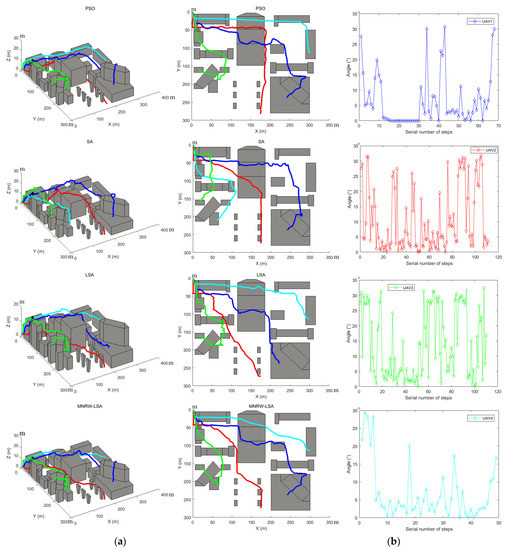 After obtaining the path segmentation, we use the GP-RRT algorithm to obtain the initial three-dimensional planning path and use the PSO, SA, LSA, and MNRW-LSA algorithms to redistribute and optimize the coordinate values of each location point of each UAV. When flying close to a building, control the altitude change to . Thus, the irregular variation loss in height is saved. The pitch angle changes of the four UAVs at each node are shown in Figure 11b.