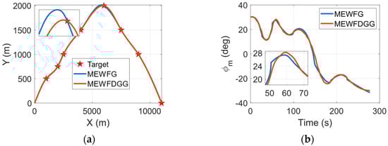 Figure 4a compares the flight trajectories of the UAV guided by both the MEWFDGGL and the MEWFG. It can be clearly seen in Figure 4a that the UAV can follow the desired waypoints when guided by these two guidance laws. Although the flight trajectories largely coincided, it can still be seen that the MEWFDGGL is better than the MEWFG law, especially near the fifth waypoint. The UAV’s flight path angle is presented in Figure 4b, which clearly shows that the UAV guided by the MEWFG takes small, sharp turns, while the flight guided by the MEWFDGGL has a smooth path. For comparison purposes, the guidance curvature command in the arc-length domain is converted into the guidance acceleration command in the time domain. A comparison of the acceleration commands between the MEWFG and the MEWFDGGL is presented in Figure 4c. As exhibited in the diagram, when the UAV guided by the MEWFG passes the waypoint, an acceleration command occurs, which suddenly grows larger, whereas the variation in the command obtained from the MEWFDGGL is quite gentle. The reason for this phenomenon can be found in the comparison shown in Figure 4g,h. The periodic variation in the UAV’s speed leads to the oscillation in the remaining flight time, while the linear variation in the remaining path length ensures the stability of the calculation.