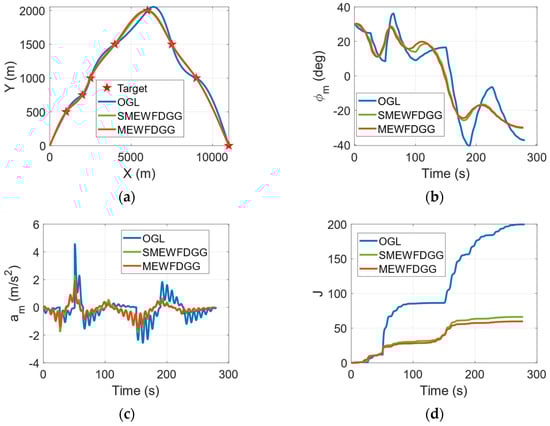 The performance of the MEWFDGGL in the experimental scenario. (a) Flight trajectory. (b) Guidance acceleration command. (c) Performance index of a. (d) The real-time speed of the UAV.