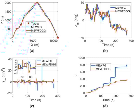 The guidance curvature command and its quantitative energy consumption obtained from the MEWFDGGL are exhibited in Figure 4e,f. By comparing it to Figure 4c,e, we can observe that the derivation that is completely independent of the UAV’s speed ensures the smoothness of the guidance curvature command. The corresponding quantitative energy consumption of the guidance acceleration commands obtained from the MEWFDGGL and the MEWFG are compared in Figure 4d. As shown in Figure 4d, we can clearly observe that the UAV guided by the MEWFDGGL requires less energy consumption than the flight guided by the MEWFG. Therefore, the UAV guided by the MEWFDGGL can be reasonably considered to have better endurance in scenarios where its speed changes. The comparison results of the performance of the proposed guidance laws are shown in Table 2.
