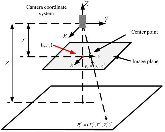 Assuming that is a point in the camera coordinate and is the observed target point in the image, the relationship between and is illustrated in Figure 2. The camera coordinate and image plane are represented by X-Y-Z and x-y, respectively. The principal point is the intersection of the Z-axis and image plane; its coordinates can be expressed as .