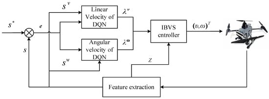 This section presents an IBVS method based on a DQN. As shown in Figure 3, the MDP model is first established. Next, the error and state are fed into two different agents, respectively. Then, the DQN is applied to solve the MDP problems and automatic servo gain. The servo gains and depth Z are input into IBVS controller. Finally, the speed control quantity is obtained.