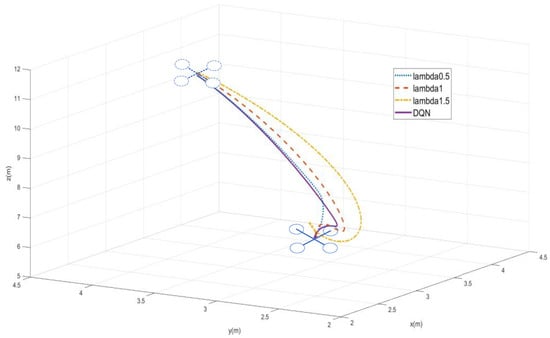 Figure 8 shows the position movement trajectories of a UAV in four cases. It can be seen that when = 0.5, the convergence needs 25 time steps. When = 1, it needs 15 time steps, and when = 1.5, it is also needs 15 time steps because it involves overshoot and for other reasons. The convergence of the adopted DQN method takes 12 time steps, and the curve has fast convergence and no overshoot.