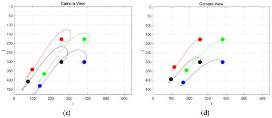 Feature trajectories in the image plane under different conditions: (a) C-IBVS ( = 0.5); (b) C-IBVS ( = 1); (c) C-IBVS ( = 1.5); (d) IBVS based on a DQN.