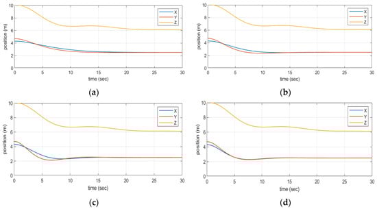 Position movement trajectory of the UAV under different conditions: (a) C-IBVS ( = 0.5); (b) C-IBVS ( = 1); (c) C-IBVS ( = 1.5); (d) IBVS based on a DQN.