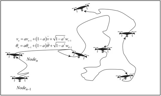 The mobile wireless network is a self-organized, centerless, dynamic topology, and mobile distributed network, which has the advantages of strong mobility, fast networking speed, the ability to adapt to harsh environments, and strong robustness [1]. It is widely used in fields such as disaster reconstruction, UAV scientific research, military warfare, and other fields. Nodes’ mobility is one of the most significant characteristics of UAV ad hoc networks [2]. Various performance indicators of the network, such as throughput, transmission delay, and routing effectiveness, are closely linked to the mobility of nodes. In UAV wireless networks, node mobility can bring greater sensing ranges, more opportunities for information interactions, and more flexible network services and applications [3]. However, node mobility also brings many problems. The movement of nodes can lead to frequent changes in network topology, which directly affects network performance, such as energy consumption, communication capacity, routing performance, etc., specifically reflected in packet loss, throughput reduction, and even network segmentation. To simulate the complex and variable motion states of nodes, mobility models are therefore proposed to describe the movement patterns, such as node position coordinates, movement speed, acceleration changes, and other information, which is an abstraction of the motion of nodes. Currently, a variety of node mobility models have been proposed, and studies have shown that different mobility models have different effects on the performance of the network protocols and algorithms [4]. As the basis for performance evaluation and network designing of related systems, protocols, and algorithms in mobile ad hoc networks, the research on network node mobility models is of great importance for improving UAV network performance.