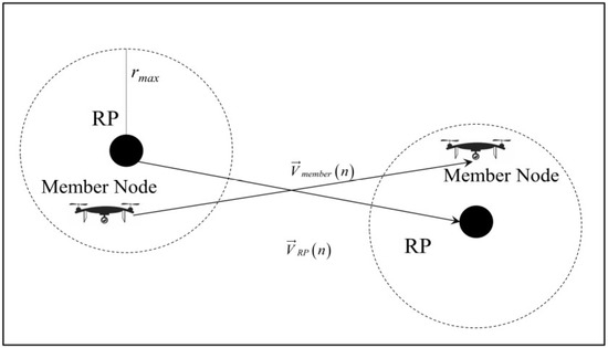 The RPGM model is shown in Figure 3. A random value of velocity and direction are generated for each node member of the group evenly at each time interval Δt. The movement of nodes in this model includes group movement and individual movement. The movement of RP and the random movement of members constitute two parts of individual movement. Generally, members are evenly distributed within a group, and each member is assigned an RP to form a group for movement. Specifically, each node member allows independent movement around the RP for each group. If the speed of RP is at time n, the speed of any of its member nodes is