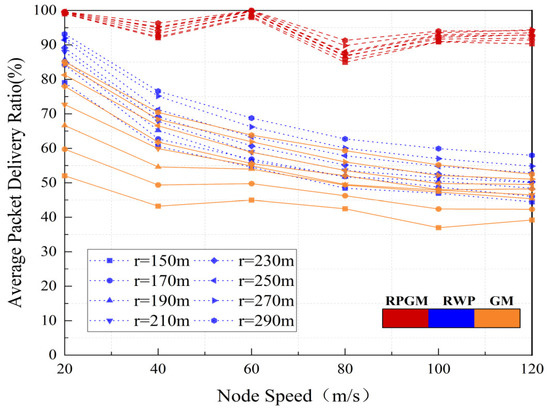 We tested and calculated the values of the parameters varying with the communication radius in the speed range of 0–20 m/s, as shown in Table 1. Different parameters exhibit different performances at the same motion speed and R. The trend of the same parameter changing with radius R also varies across different motion models. At the same time, we store and convert all the motion processes into NS2 motion files for subsequent network performance simulation in the same motion scenario. Finally, the data of each speed and index under unique random seed and communication radius are statistically recorded.