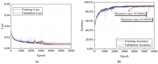 The performance of the training and validation datasets during the BPNN training process: (a) the performance of training loss and validation loss; (b) the performance of training accuracy and validation accuracy.