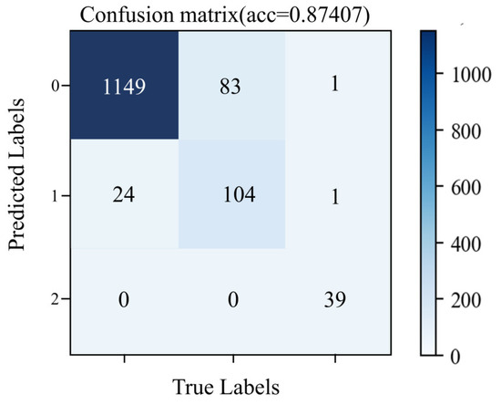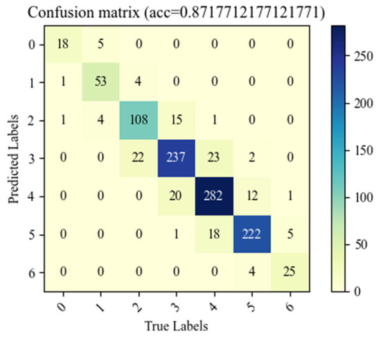 As the number of training epochs increases, the loss of the test and validation sets shows a decreasing trend and remains stable after 4300 epochs. The maximum value of training accuracy was 93.19305%, and the maximum value of validation accuracy was 93.02666%. In order to verify the generalization of the model, we saved the network parameters with the highest accuracy rate in the training process and then used different motion speeds and random seeds to generate a batch of new GM mobility scenes. After processing the data according to the above process, we used them as the test dataset. After using the test data as the input of the neural network, the accuracy of network performance classification is shown in Figure 8.