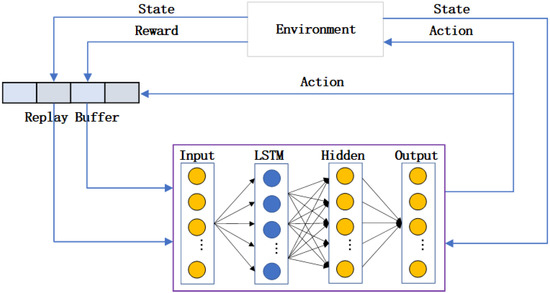 The organisation of the DDPG-LSTM is mainly built on the actor–critic model. The actor network of the agent is responsible for generating actions and contains two components: the actor network and , where and are the network parameters. The critic network of agent is responsible for evaluating actions and contains two components: the critic network and , where and are the network parameters.