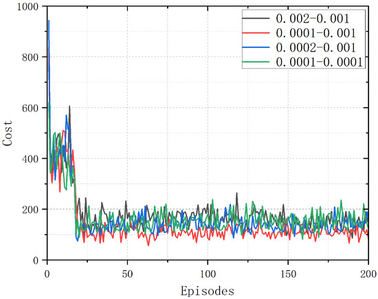 Figure 3 represents the performance of the algorithm at different learning rates. The update step’s size affects the convergence speed, and when the learning rate is too low, the algorithm converges slowly. When the learning rate is too high, the maximum value may be missed due to the excessive size of the update step. The graph shows that the algorithm performs optimally if and . In addition, it can be found that the network performs better when is greater than because the actor network needs guidance from the critic network to learn. When the critic network learns faster than the actor network, it can better guide the update direction of the actor network.
