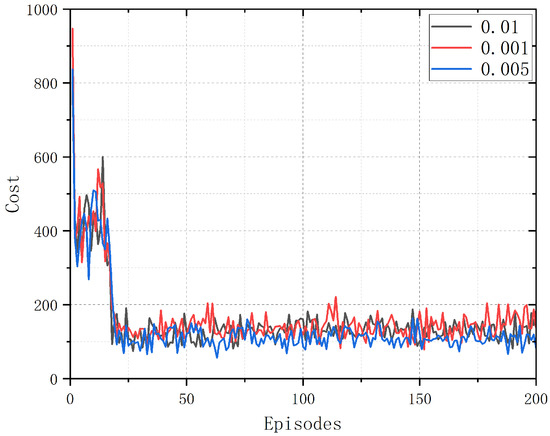 Figure 4 shows the algorithm’s performance under different soft update rates. Compared to the complex update strategy, the upgrade interval of the objective network is reduced by the soft update strategy. It ensures that the target mesh is updated in every iteration, increasing the frequency of updating the target mesh and helping to decrease the time taken for the algorithm to converge. The smaller the soft update coefficient, the more stable the algorithm will be and the less the parameters of the target mesh will change, resulting in a too-slow convergence of the algorithm. If the soft update coefficient is too large, the algorithm will be unstable. Therefore, an appropriate soft update factor can make the algorithm stable and fast. The figure illustrates that the best performance of the algorithm is achieved when the soft update factor is .
