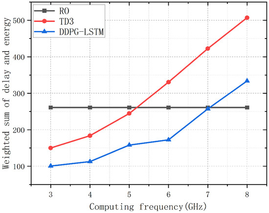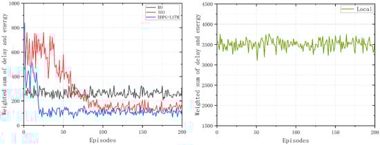 In simulation experiments, the DDPG-LSTM algorithm proposed in this paper is compared with random offloading (RO) [45], Twin Delayed DDPG (TD3) [46,47,48] and local computing(Local), using the weighted sum of latency and energy consumption as evaluation criteria [36,49]. Then, the performance of the algorithm is compared under different computational resources and task volumes, validating the performance advantages of the algorithm.