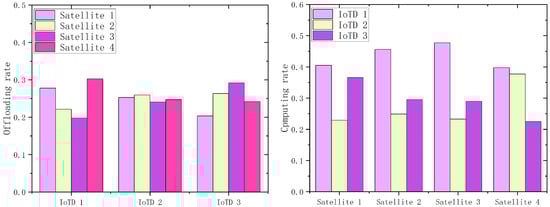 Figure 10 shows four IoT devices, with three of the satellites providing edge computing capability. The altitude and computing resources of the satellites affect the mission offload, and similarly, the distribution of computing resources is affected by the mission offload. For satellite communication, transmission costs increase with altitude, and higher altitudes prolong the latency and energy consumption spent in the space segment during the computed offload. In satellite edge computing, lower computational resources and larger task offloads increase the processing latency and energy consumption of the task.