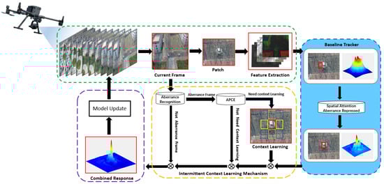 As can be seen from Figure 1, our proposed tracker consists of two modules: a spatial attention aberration suppression module and an intermittent context learning mechanism. The spatial attention aberration suppression module effectively suppresses aberrations, while the intermittent context learning mechanism first determines whether the current frame is an aberrance frame or not. If it is an aberrance frame, the APCE criterion is employed to decide whether the global context learning is needed. The APCE criterion is used to determine the necessity of global context learning.