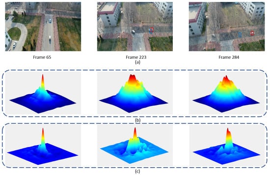 where is the response map of the k-th frame, p and q represent the position differences of the peak values of the response maps in the previous and current frames, and the shift operation is used to align the peak positions of the two response maps. When aberrance occurs, the similarity of the response maps decreases, resulting in a higher value of . In order to suppress the generation of aberrance during the filter training process, the training objective of the filter is optimized to minimize the following loss function: