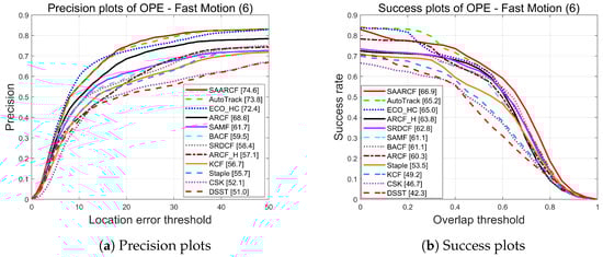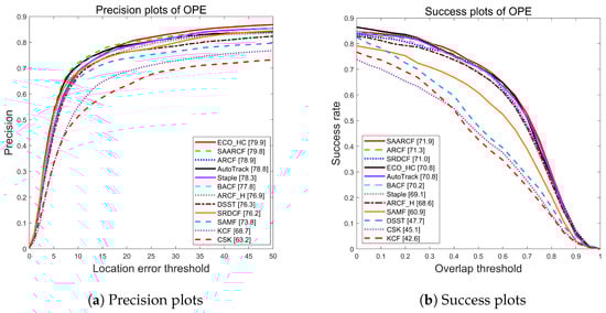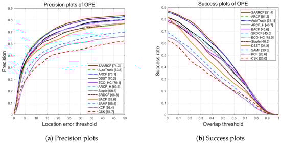 In this chapter, to evaluate the performance of the proposed algorithm, we conduct quantitative and qualitative experiments on two challenging UAV target tracking datasets, UAVDT and Visdrone2018. The results are compared with 11 other state-of-the-art trackers that use handcrafted features, including: AutoTrack, ECO-HC, ARCF (HOG + CN), ARCF-H (HOG), SRDCF, BACF, Staple, DSST, SAMF, KCF, and CSK. To ensure the fairness of the real-time evaluation, the code obtained from each author’s webpage was uniformly run on the author’s computer, rather than directly using their evaluation results. If readers are interested in understanding the specific parameters set by the authors during their testing, they can refer to the literature [,,,,,,,,,] for detailed information. The tracker’s settings and parameters used in my testing are the same as those used by the authors in the original study. The experiments can be divided into overall performance evaluation and sub-attribute performance evaluation. These datasets cover various complex scenes and diverse attributes in the UAV tracking domain and are widely used to verify the effectiveness of tracking algorithms in UAV scenarios.