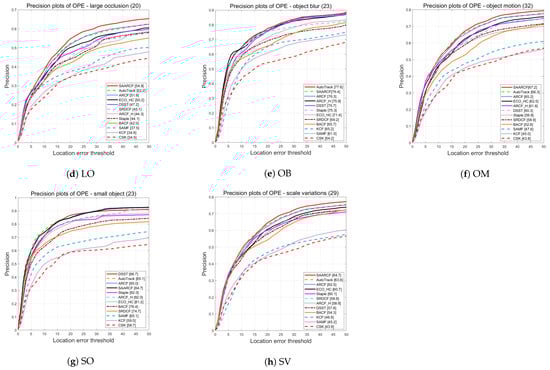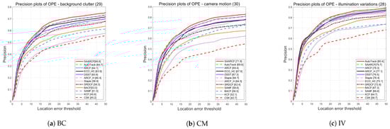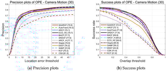 The evaluation results for the 13 attributes of the Visdrone dataset are shown in Figure 8. Figure 8 presents the comparison of precision and success rates for trackers on the 13 attributes in the Visdrone dataset. SAARCF outperforms the baseline tracker in all 13 attributes. The precision rates were: VC (0.819), SV (0.766), SO (0.641), PO (0.737), OV (0.802), LR (0.706), IV (0.856), FO (0.701), FM (0.746), CM (0.799), BC (0.663), and ARC (0.799). The success rates were: VC (0.787), SV (0.674), SO (0.540), PO (0.698), OV (0.693), LR (0.461), IV (0.818), FO (0.664), FM (0.669), CM (0.722), BC (0.543), and ARC (0.661). SAARCF ranks first in both the success and precision rates for the CM, FM, and SO attributes. Figure 9, Figure 10 and Figure 11 show the precision and success rates of various trackers for these three attributes, respectively.