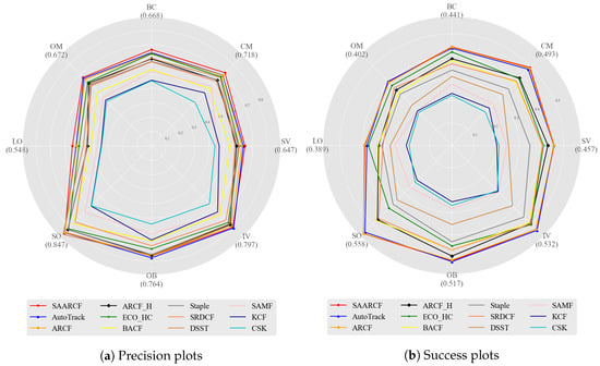 Figure 5 and Figure 6 demonstrate the comparison of precision and success rates for 8 attributes on the UAVDT dataset. As can be seen from the figures, SAARCF achieves an improvement of more than 10% in all 8 attributes compared to the baseline tracker. In contrast to the other trackers, SAARCF achieves scores of SV (0.647), CM (0.718), BC (0.668), OM (0.672), and LO (0.548), while the overall performance of Autotrack, which is the second-best, improves by SV (1.7%), CM (3.2%), BC (3.2%), OM (1.3%), and LO (4.9%). SAARCF obtains the highest success rates for the attributes SV (0.457), CM (0.493), BC (0.441), and SO (0.558), with improvements over Autotrack of SV (0.4%), CM (2.2%), BC (1.1%), OM (1.3%), and OB (1.6%). Figure 7 provides a more intuitive comparison of the performance of various trackers in the 8 attributes.