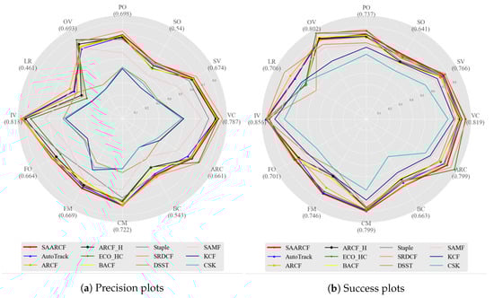 The overall performance evaluation results of the SAARCF algorithm on the Visdrone benchmark are shown in Figure 4, and it should be noted that the performance evaluation values in the figure are all percentages. The precision and success rate are 0.798 and 0.719, respectively, which are 2.6/2.4% higher than those of the baseline tracker, and it also has a better overall performance compared to other advanced trackers. Although the precision is slightly lower than ECO-HC by 0.01, the success rate is higher than ECO-HC by 0.19, so the comprehensive performance is still better than ECO-HC.