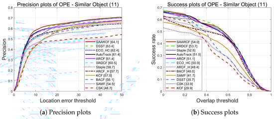 Due to the introduction of the spatial attention aberrance suppression module, SAARCF can effectively cope with the distortion of the environment and targets. This is evidenced by the highest scores achieved by SAARCF in the CM and MO attributes in Figure 9 and Figure 10. Moreover, Figure 11 shows that SAARCF performs better in dealing with similar target interference compared to other trackers, which further confirms that learning the global context can effectively enhance the filter’s ability to distinguish targets.