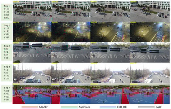 To more intuitively analyze the effectiveness of SAARCF, we selected five video sequences from the UAVDT dataset for evaluation. We compared SAARCF with two other top trackers (AutoTrack and ECO-HC) and a baseline tracker (BACF). The tracking results are shown in Figure 12.