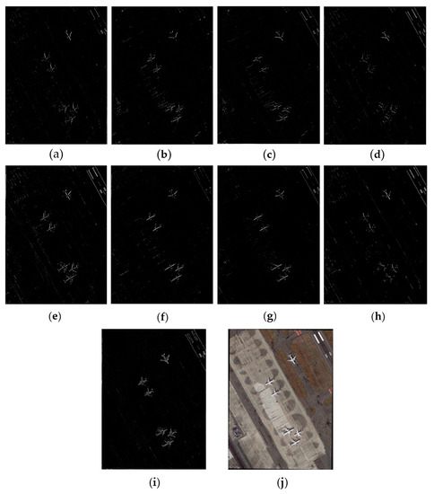 Figure 5 shows the results of the image filtered by the improved Gabor filter. (j) is a raw image selected for us with blur, noise, and similar backgrounds. In (a) to (h), eight filters were used to filter the image from eight directions and obtain feature maps. It can be seen that the edges of objects in the same direction as the filter have been significantly enhanced. The final composite image is shown in (i), and it is evident that the edges of the aircraft in this image have been truly enhanced. This indicates that the method we proposed is effective.