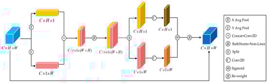 where f C / r × H + W is the intermediate feature that contains both horizontal and vertical spatial information, r is the reduction factor, and δ is the nonlinear activation function. There is no intense fusion of these two features. The main purpose of concatenating is to unify BN operations. f is then divided into two separate features, f h C / r × H and f w C / r × W , using the other two 1 × 1 convolutional kernel and sigmoid function transform features so that their dimensions are consistent with input X (C × H × W), such as Formulas (10) and (11).