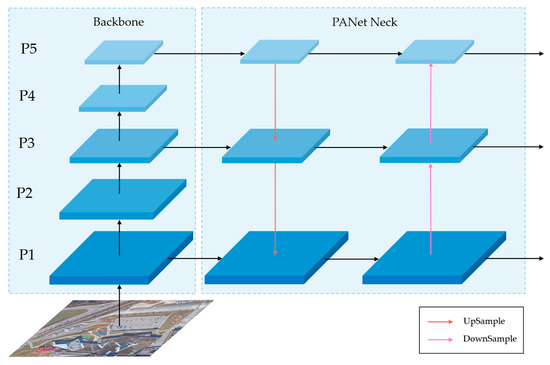 The neck network part of YOLOv5 consists of a feature pyramid network structure, PANet, aimed at fusing different scale features input from the backbone. Although the original FPN structure improved the high-level semantic information in the prediction feature map, much of the location information in the underlying feature map is lost. Therefore, PANet adds a bottom-up channel on the basis of the FPN to transmit the location information to the prediction feature map such that the prediction feature map simultaneously has both high semantic and location information. This can greatly improve the accuracy of object detection. The specific structure of PANet is shown in Figure 7.