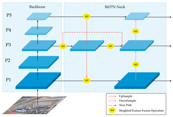 • PANet is replaced by BiFPN on the neck of YOLOv5. Developed on the basis of PANet, in BiFPN (1) the network is simplified by deleting nodes without feature fusion and with little contribution to output, (2) an additional feature branch is added across intermediate nodes between the original input and output nodes in the same layer to fuse feature information from more layers, and (3) input feature layers with different resolutions are weighted to balance their respective contributions, which is beneficial for improving training speed and efficiency.