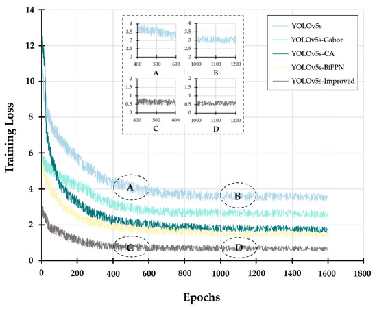 The training experiment parameters are shown in Table 2. A stochastic gradient descent (SGD) optimizer with a momentum of 0.937 was used to train the network. The initial learning rate was 0.001, the weight decay was 0.0005, and the batch size was set to 32. A total of 1600 epochs were trained.