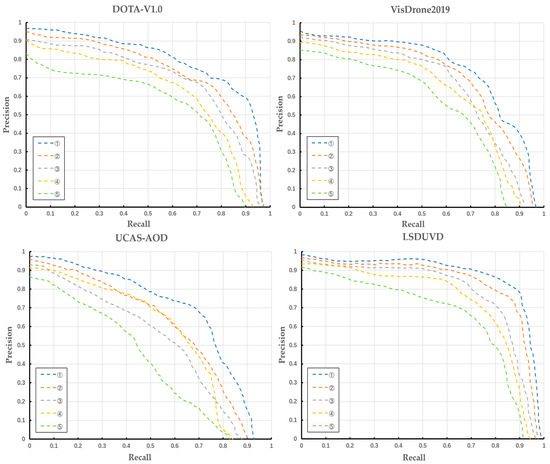 From the perspective of method, the baseline model YOLOv5s has the worst precision–recall performance compared with the four models YOLOv5s-Gabor, YOLOv5s-CA, YOLOv5s-BiFPN, and YOLOv5s-Improved. The detection performance of the model combined with each improved module has been improved to varying degrees, and the detection effect of YOLOv5s-CA and YOLOv5s-BiFPN is better than that of YOLOv5s-Gabor in general. YOLOv5s-Improved has the best performance of the precision–recall rate among all models in this experiment, which further shows that the overall improved YOLOv5s model integrating Gabor, CA, and BiFPN is efficient in the object detection task of UAV aerial images.