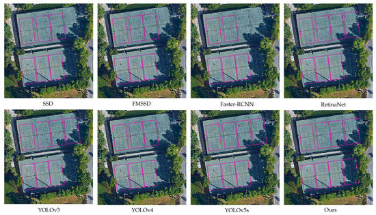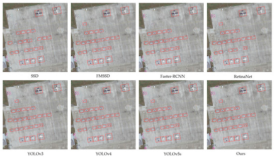 To further validate the efficient detection performance of our proposed method, we compared several common object detection algorithms, such as SSD [22], FMSSD [68], Faster-RCNN [26], RetinaNet [69], YOLOv3 [30], YOLOv4 [31], and YOLOv5s. The detection experiment was conducted on the dataset LSDUVD, and the A P (%) and m A P (%) results of each target are shown in Table 4. We have abbreviated the target names in the dataset as follows: PE, plane; SP, ship; BE, bridge; HR, harbor; HP, helicopter; RT, roundabout; ST, storage tank; TC, tennis court; BD, baseball diamond; SV, small vehicle; LV, large vehicle; SL, swimming pool; BC, basketball court; SBF, soccer ball field; GTF, ground track field; PN, pedestrian; MT, motor; BI, bicycle; ATE, awning tricycle; TE, tricycle; PR, person; VN, van; BS, bus. By analyzing the A P and m A P values in the table, overall, our method has the highest m A P (81.8%) in all categories of object detection, which is 5.4% higher than other models with the highest m A P . Specifically, in the detection of large and medium-sized targets such as soccer ball fields, basketball courts, baseball diamonds, roundabouts, large vehicles, swimming pools, etc., our model is not significantly different from other models in having the best detection results, as they all have high detection A P values. This indicates that our method has good detection accuracy in the detection of medium-sized and large targets. In terms of small object detection, compared with the best detection results of the other seven methods in Table 4, our model increased the A P values of small objects such as planes, ships, storage tanks, small vehicles, and pedestrians by 1.6%, 5.3%, 7.3%, 7.4%, and 0.6%, respectively. This indicates that our model has the best detection ability for small objects, especially for dense small objects such as ships, storage tanks, and small vehicles, which have more obvious detection effects.