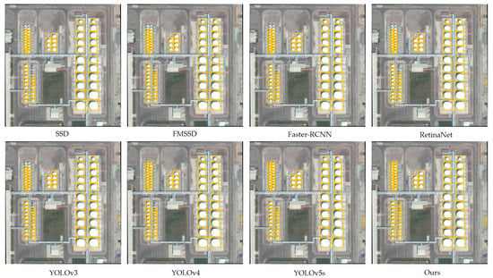 In Figure 15, we selected an image type with densely arranged small objects and blurred backgrounds. From a subjective perspective, our method has the lowest missed detection rate, while other methods have varying degrees of missed detection. Some models, such as SSD, Faster-RCNN, and RetinaNet, have more severe issues with missed detection. From this, it can be inferred that densely arranged small targets and fuzzy backgrounds pose a significant challenge to the model’s detection ability, which requires the model to have a strong ability to extract small target features against fuzzy backgrounds. For our model, in the process of object edge enhancement through multi-directional Gabor convolution, not only does the target contour become clear but blurry background information is also filtered out. At the same time, combining CA and BiFPN mechanisms, the model can effectively extract and fuse multi-dimensional information for small object regions, minimizing the problem of sparse and difficult-to-detect small object pixels.