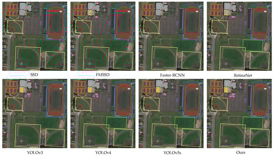In Figure 16, we selected the image type of multi-scale objects. Overall, our model pays comprehensive attention to various levels and types of objects in multiple-scale object detection tasks, with not only the lowest missed detection rate but also the best regression effect between the predicted box and the real box. During the detection process, there are several types of targets: large-scale soccer ball fields with contour areas that are very similar to the background, small and densely arranged storage tanks, and small vehicles. These targets receive low attention from the model and are often overlooked during the detection process, which is the biggest difficulty for the model in multi-scale detection tasks. Our model, under the combined action of the CA mechanism and other modules, can fully integrate the feature information of various targets while considering obvious regional targets, paying more attention to targets with complex backgrounds and smaller scales. Compared to other models, our model can effectively overcome this problem.