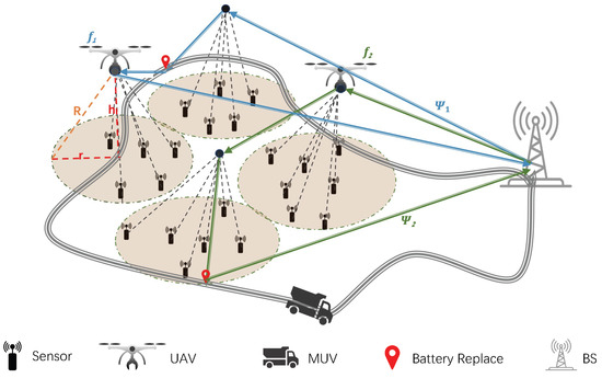 32], Zhu et al. investigated the problem of UAV-assisted data collection in large-scale wireless sensor networks based on a truck carrying spare batteries for the UAV’s battery replenishment. In [