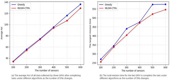 Figure 4a,b that regardless of the number of SNs, both the average AoI and the largest mission time based on the MUSM-CTPA algorithm are smaller than those based on the greedy algorithm. This is because the UAV flight trajectory obtained by MUSM-CTPA is more reasonable and closer to the global optimal solution. Therefore, the number of battery replacement times for the UAVs by the MUV will be correspondingly reduced, and the service scheduling of the MUV will be more reasonable, which decreases the average AoI of all the collected data after all UAVs return to the BS and the total mission time after the last UAV returns to the BS.