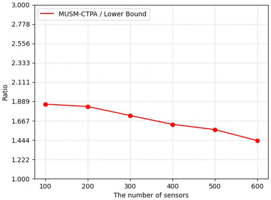 Figure 6 shows the ratio of MUSM-CTPA to the lower bound. It can be seen that the ratio gradually decreases as the number of SNs increases, and the ratio is always greater than or equal to one and less than or equal to two. This is because the MUSM-CTPA algorithm not only plans the flight trajectories of multiple UAVs but also designs a strategy for the MUV to replace the UAVs’ batteries to optimize the data collection process. This result validates the effectiveness of MUSM-CTPA in achieving efficient data collection.