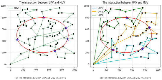 Figure 8a,b. This is because, compared with one UAV, multiple UAVs performing tasks at the same time may have a longer total flight distance, but the task execution time is much shorter.