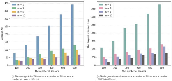 Figure 9a,b show the average AoI and the largest mission time when the number of SNs increases from 100 to 600 by 100 under different numbers of UAVs, respectively. It can be seen that both the average AoI and the largest mission time gradually increase as the number of SNs increases under any number of UAVs. This is because, as the number of SNs increases, the number of data collection hover points visited by UAV increases. The number of SNs required to be served at each data collection hover point also increases, and the corresponding hovering time further increases, which will increase the average AoI of all collected data after the UAVs return to the BS, and the total mission time of the last UAV returning to the BS becomes longer.